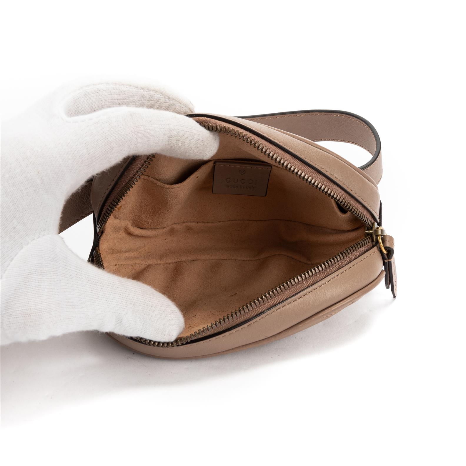 Styled in light pink leather with a light pink leather strap and gold hardware, 17 x 12 x 5cm.
