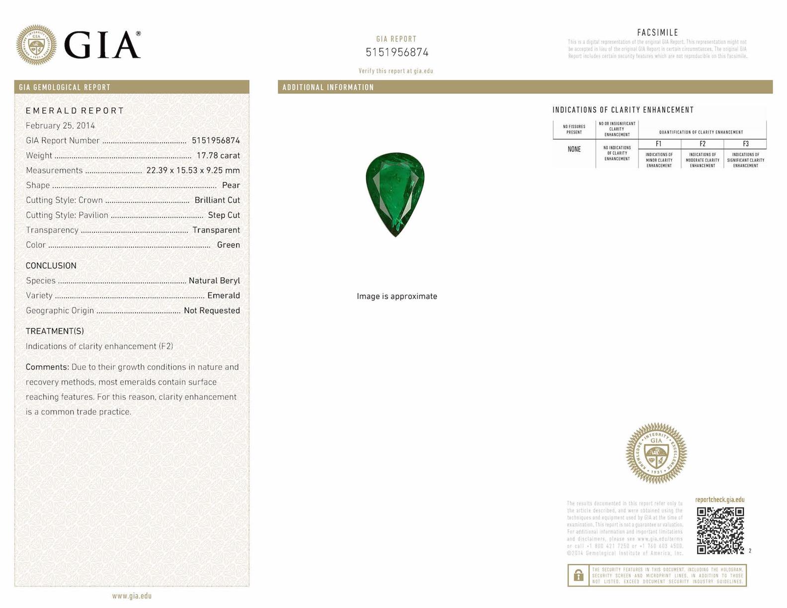 a GIA report numbered 5151956874, dated 25 February 2014, stating that the 17.78 carat green emerald is natural, with indications of clarity enhancement (F2);