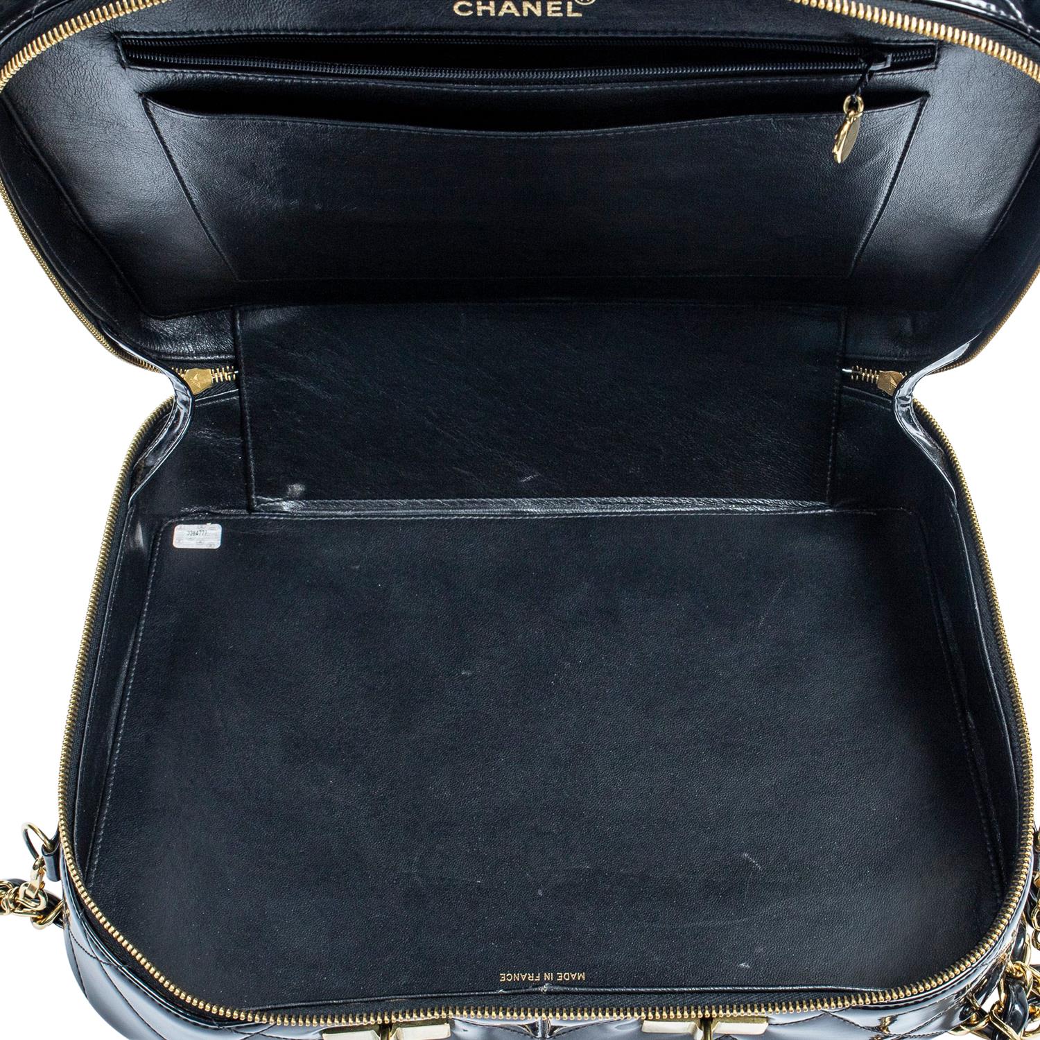 Styled in black quilted patent leather with interlaced chain shoulder strap and gold tone metal hardware, 34.5 x 25.5 x 10cm.