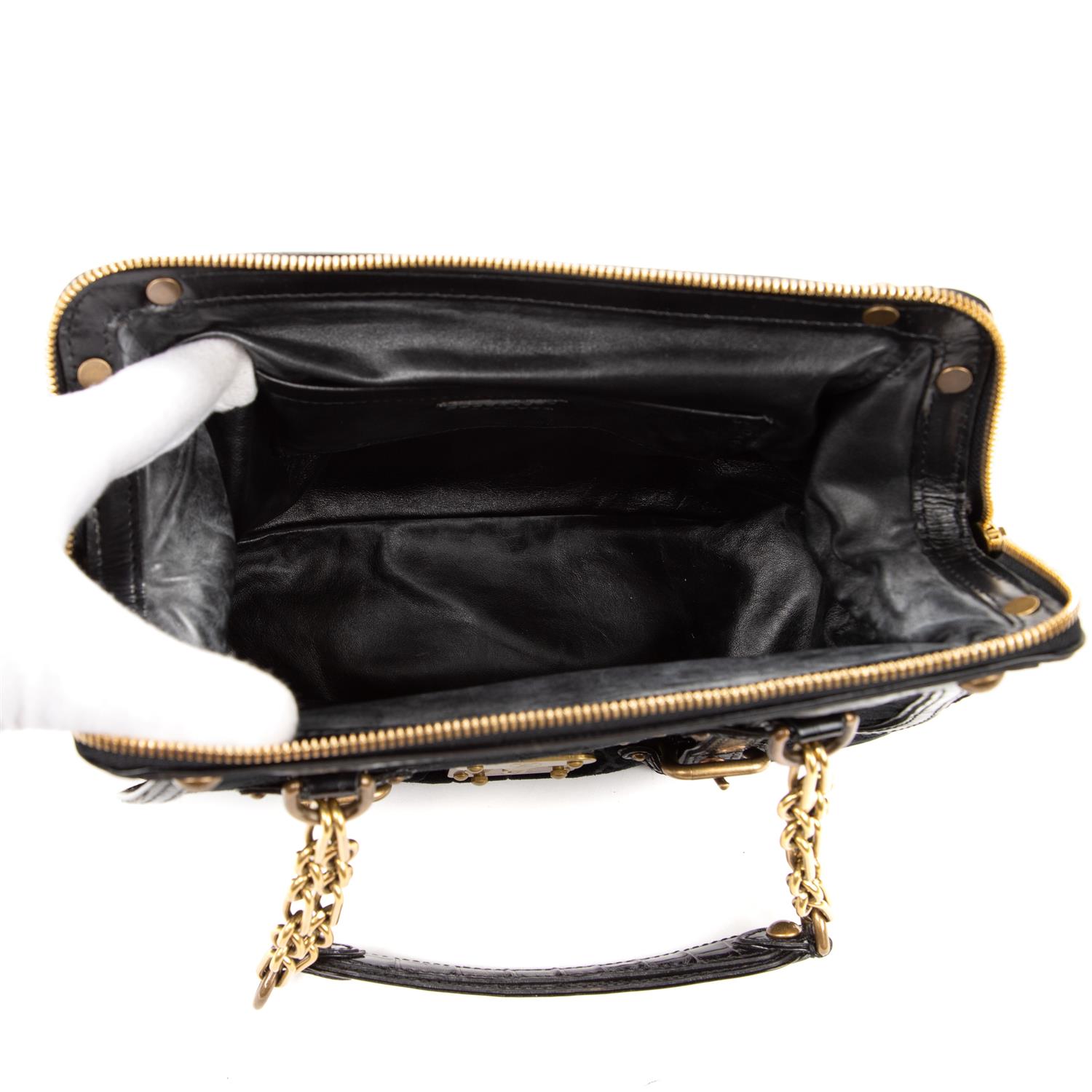 Styled in black monogram velvet with black crocodile and chain handles and gold tome metal hardware, 26 x 22 x 9cm.