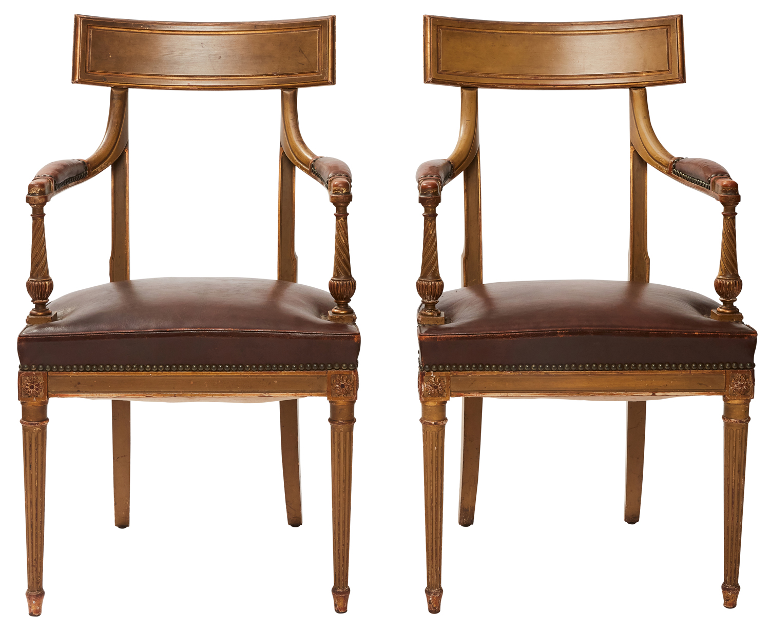 Late 18th century, each with a moulded panel toprail above a pair of padded arms on spirally fluted baluster supports, flanking the upholstered seat, on tapering fluted front legs with patera headers, decorated pale green and gilt, having close nailed leather upholstery.
