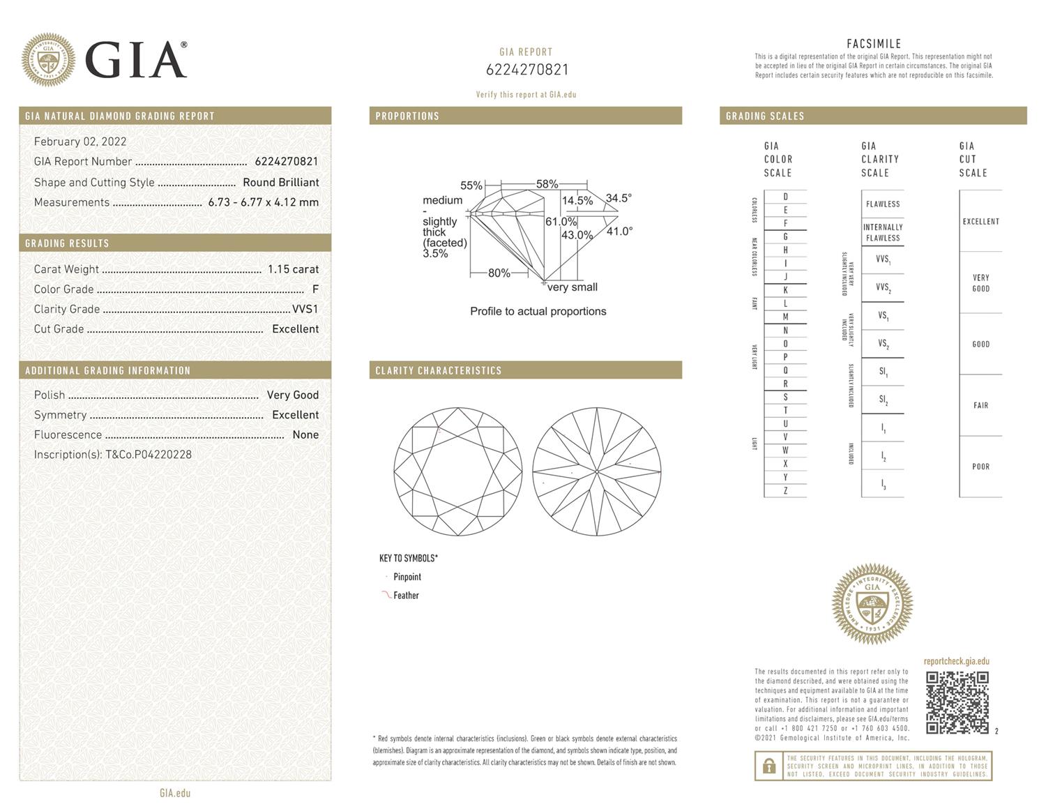 a GIA report numbered 6224270821, dated 2 February 2022, stating that the 1.15 carat diamond is natural, F colour, VVS1 clarity, laser inscribed T&Co.P04220228;