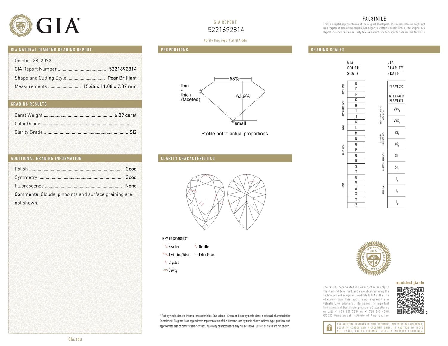 Accompanied by a facsimile GIA report numbered 5221692814, dated 28 October 2022, stating that the 6.89 carat diamond is natural, I colour, SI2 clarity.