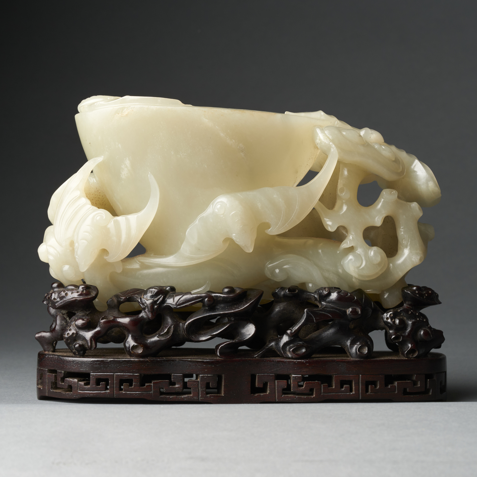 A CHINESE PALE CELADON JADE "LINGZHI AND BATS" BRUSH WASHER, QING DYNASTY, 18TH CENTURY