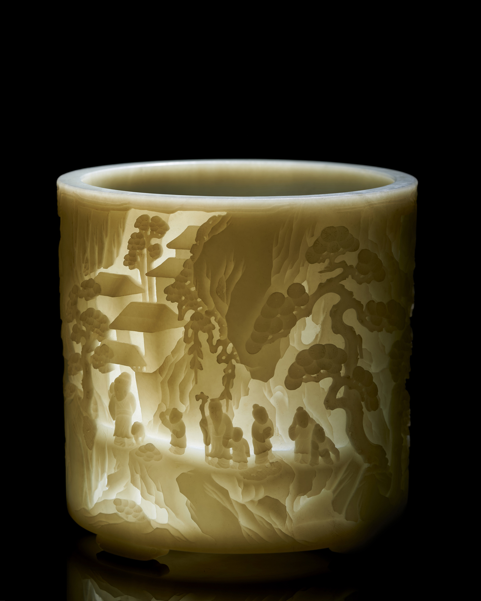 Imperial jade carving of the Qing dynasty was distinguished by its abundant material, technical precision, and refined design. Supplied with the finest Hetian jade from Xinjiang, court workshops were able to achieve works of both elegance and grandeur. This brush pot, with its fluid lines, naturalistic detail, and vivid human presence, epitomises the highest standards of Qing jade craftsmanship and ranks as a masterpiece of the genre.