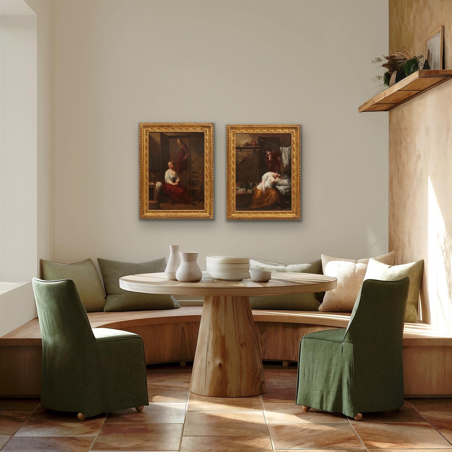 These hitherto unpublished works are almost certainly near contemporary copies after a group of small genre subjects that Crespi painted in the 1720s, and may have been commissioned by an English patron. The group has yet to be fully established, but are collectively known under the title, Vita di una canterina (see D. Biagi Maino, 'Giuseppe Maria Crespi e la realtà popolare' in Il Popolo nel Settecento, ed. A.M. Rao, Rome, 2020). These gently comic and mildly satirical scenes, are related to La pulce (or 'Woman searching for fleas'), of similar dimensions (55 x 41 cm), now in the Musée du Louvre (RF 1970 40). The present two pictures, one depicting a woman seated with a small dog, while another figure is seen through a doorway descending the stairs; and a sleeping woman with a man in a doorway gesturing to us to be silent, are typical of these evocative domestic interiors. The figures portrayed are not from high society, but rather servants and working people, yet they retain a sense of dignity despite the simple, even squalid interiors that they inhabit. These compositions would appear to be the only surviving copies after Crespi's untraced originals. Crespi's genre scenes such as these were influential on a number of later artists, including William Hogarth (1697-1764) and the French Romantic painters of the early nineteenth century.