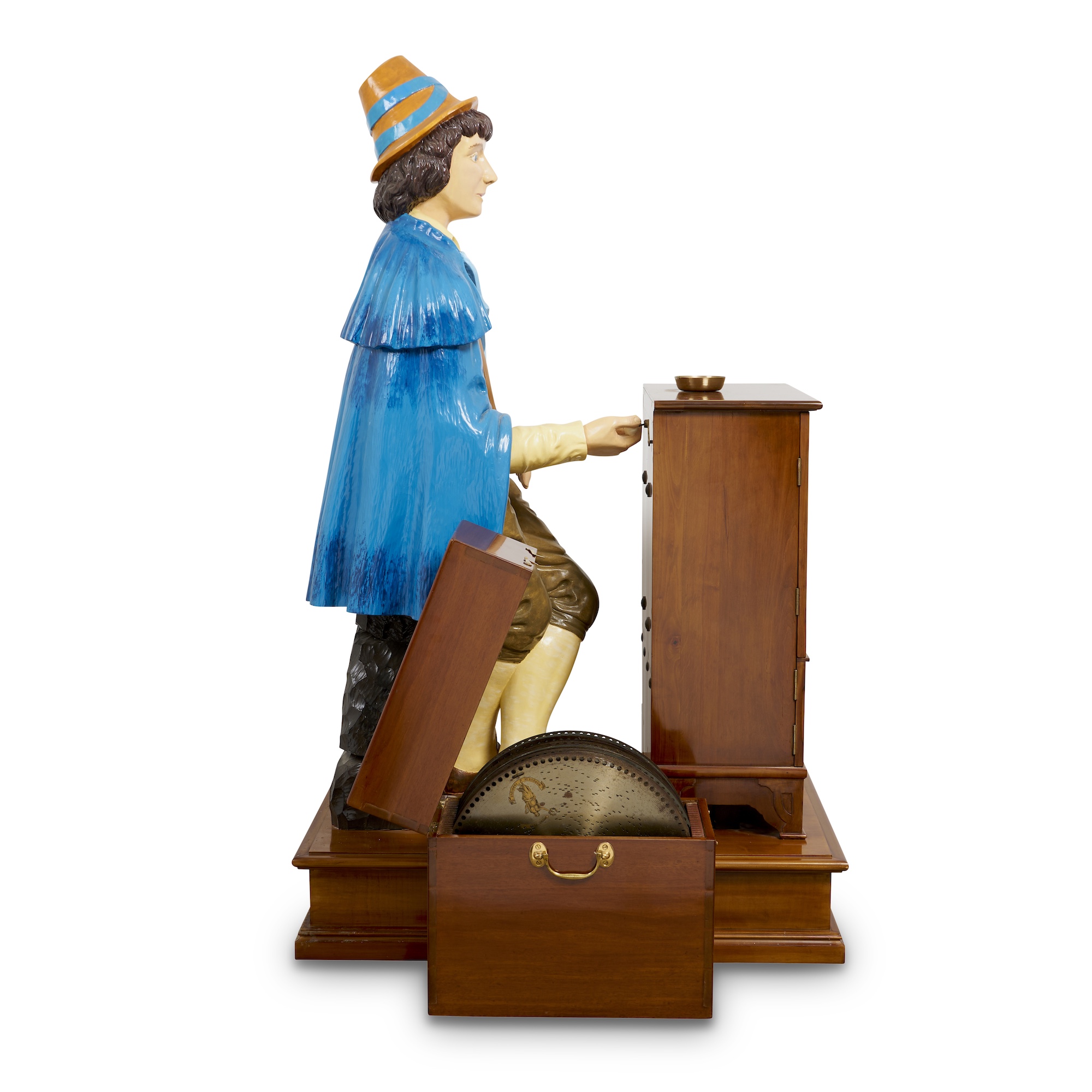 The coin-operated and crank-wound double-comb disc music box on reeded cast gilt bedplate, within a decorated walnut case, the hinged door with box-frame mirror-back compartment with 'Monkey dancers' automaton, the music box mounted on a later polished wood plinth box base with a polychrome painted full length figure of a young Savoyard organ grinder, holding a crank, together with a travelling case containing sixteen 40cm discs