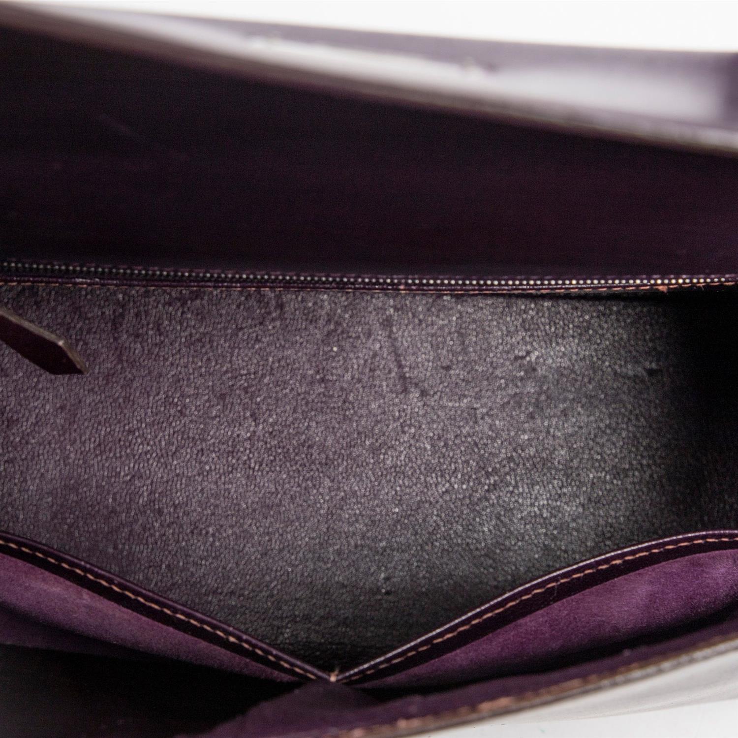 Styled in Cassis Box leather with conforming top handle, detachable shoulder strap and silver tone metal hardware, 28 x 22 x 11cm.