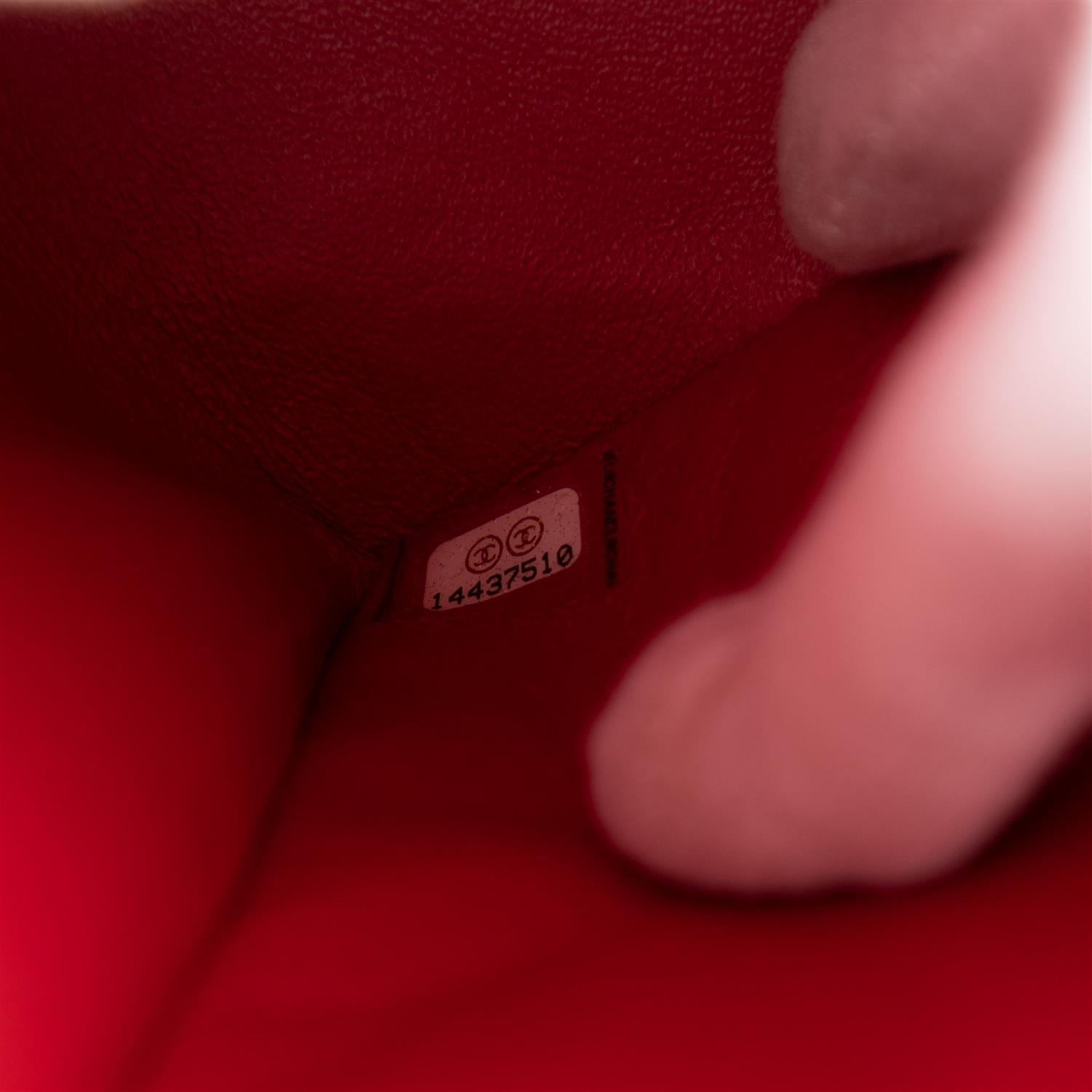Styled in red quilted patent leather with interlaced chain shoulder strap and silver tone metal hardware, 33 x 23 x 9cm.