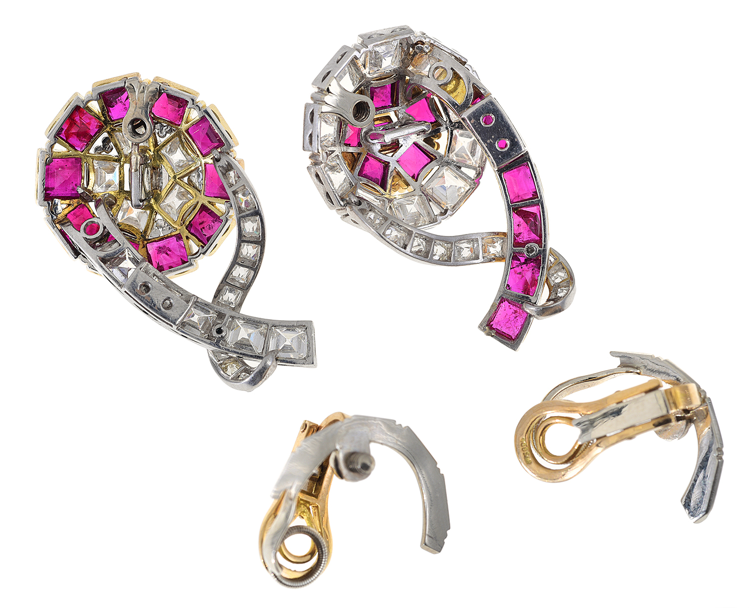 Modelled as a stylised floral spray, the first clip centrally set with six princess cut diamonds surrounded by ten carre cut rubies, with further princess and old European cut diamonds set to the stems, the other clip centrally set with carre cut rubies surrounded by ten princess cut diamonds with further old European cut diamonds and carre cut rubies set to the stems, all mounted in 18ct yellow and white gold.