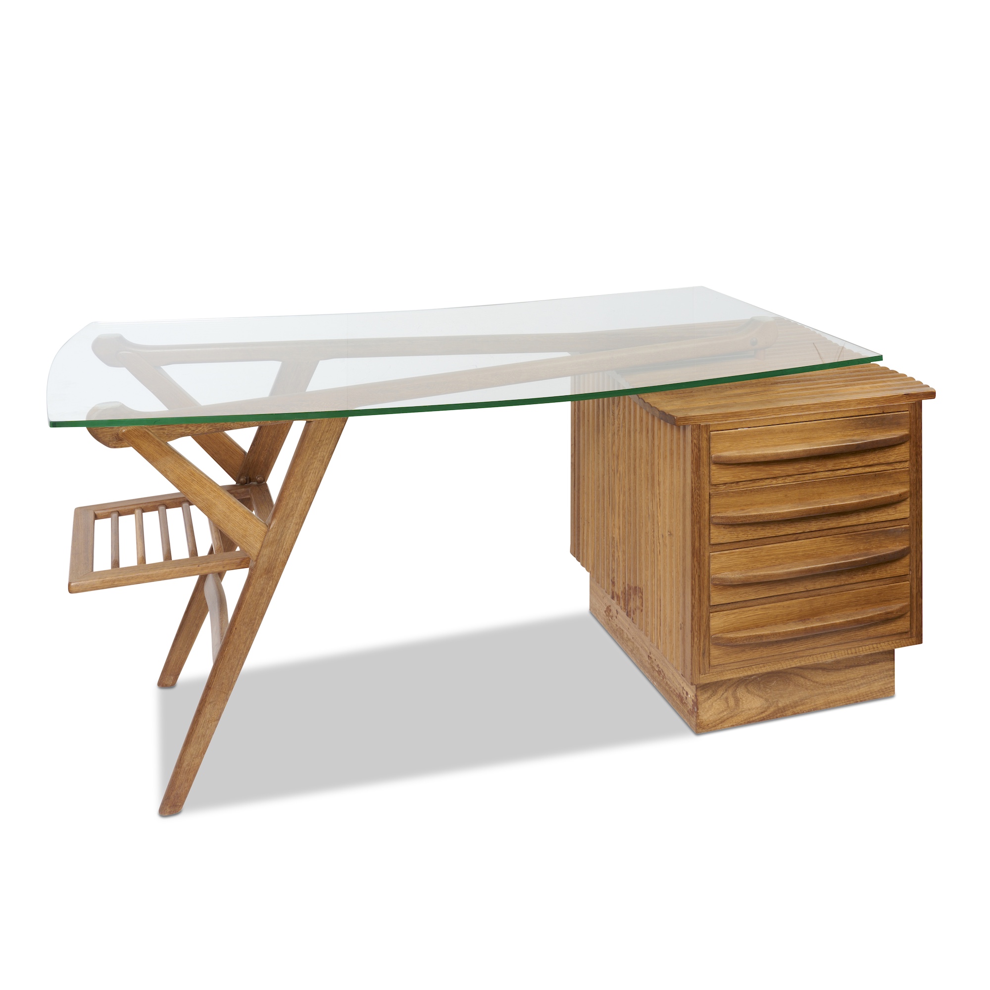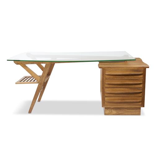 The lightly-curved rectangular bevelled glass top on a hairpin-shaped framed raised on a pedestal of drawers to one side and a pair of splayed and cantilevered supports to the other, the pedestal with ribbed top and sides enclosing four drawers to its front and a shallow bookcase to the rear, the supports with a removeable mid-height slatted shelf, the angle of the pedestal relative to the top adjustable (the top pivoting on the pedestal)