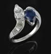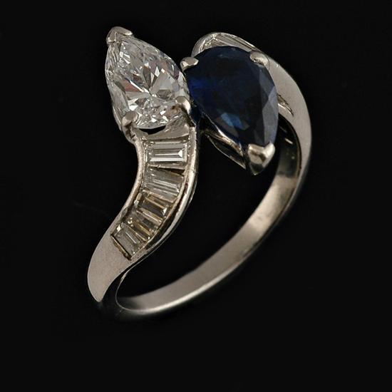 The crossover ring set with a pear cut diamond weighing 1.05cts and pear cut sapphire weighing 1.20cts, the curved shoulders channel set with tapered baguette cut diamonds, all in platinum, attributed to Oscar Heyman.
