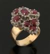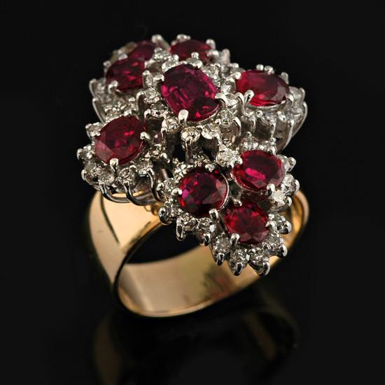 Set with nine oval cut rubies bordered by single cut diamonds, all claw set in 14ct gold.