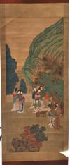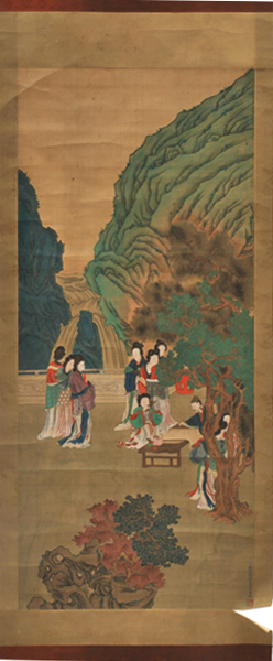 Scroll depicting a court patio filled with young women waiting to have their scroll signed by the residing artist who sits before his bench