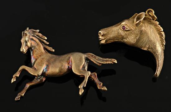 The brooch designed as a galloping horse and the finely detailed horse head pendant set with ruby, both in 14ct gold, total weight 23.0gms.