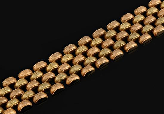 Comprising five rows of engraved convex links all in 18ct rose and yellow gold, total weight 75.5gms, total length 190mm.