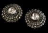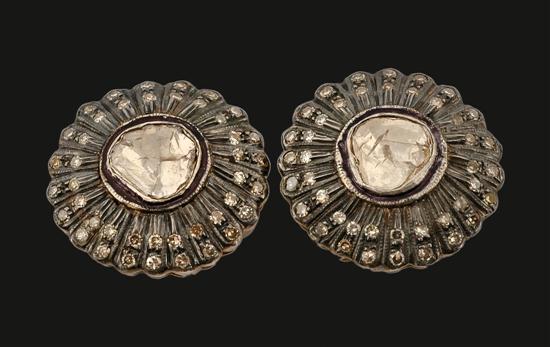 The floral design earrings centrally set with a mine cut diamond surrounded by small single cut diamonds, all in silver and 14ct gold.