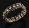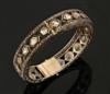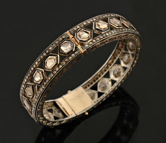 The open work hinged bangle set with twenty one mine cut diamonds bordered by small rose cut diamonds, all in silver and 14ct gold.