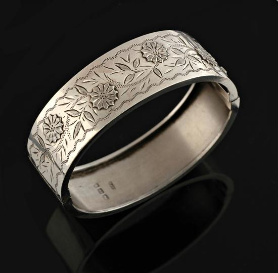 The sterling silver hinged bangle with engraved floral and foliate design, hallmarked Birmingham 1884.
