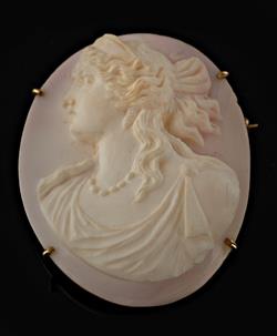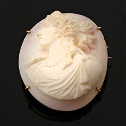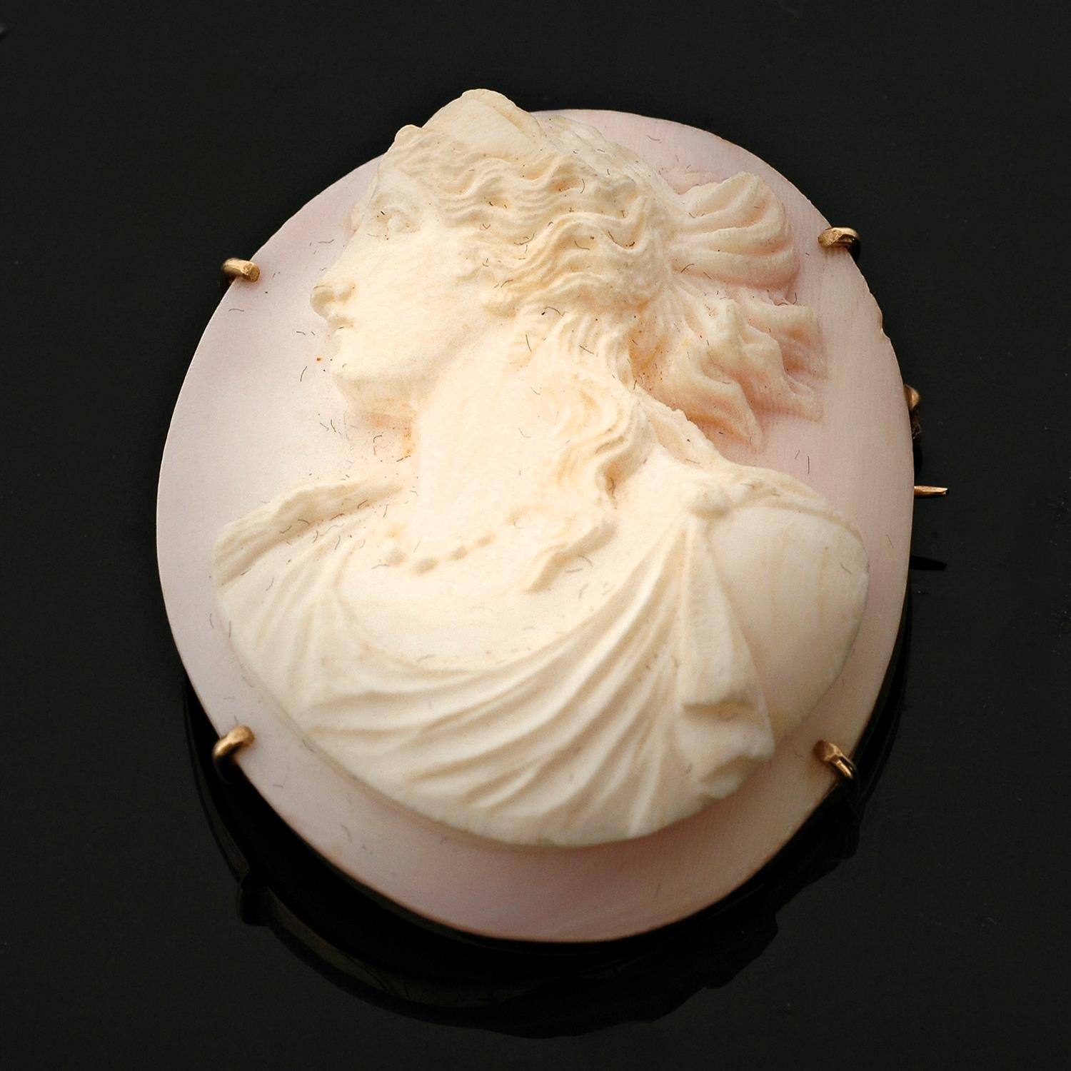 The conch shell cameo depicting a classical maiden in profile, to a 9ct gold mount.