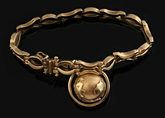 The fancy link bracelet with rotating globe charm in 8ct gold, total weight 18.3gms, total length 190mm.