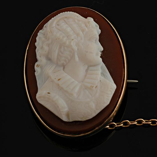 The oval brooch of carved sardonyx depicting the profile of a lady, in 9ct gold mount, independant valuation available.