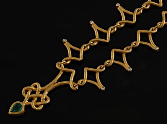 The open wirework necklace with emerald set drop and six diamond set links all in 18ct gold, total weight 39.0gms, total length 400mm, with a pair of gold earrings of conforming design. See illustration.