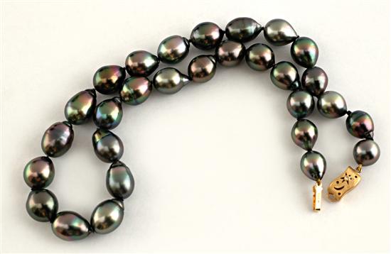 Comprising twenty nine baroque pearls of aubergine and silver grey hues measuring 10.1mm to 12.5mm, to a fancy 18ct gold diamond set clasp.