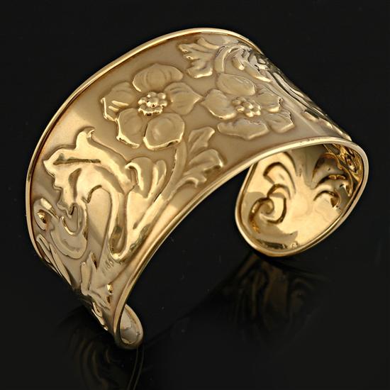 The embossed cuff with floral and foliate design, all in 18ct gold, total weight 22.0gms.