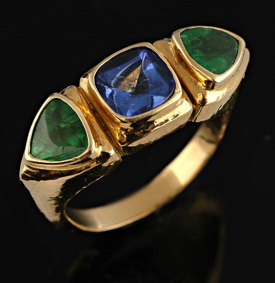 Centrally set with a Ceylon coloured sapphire flanked by two trilliant cut emeralds all cut en cabochon with faceted pavillions, all in 18ct gold. See illustration.