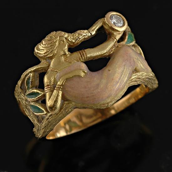 Featuring a reclining maiden holding a round brilliant cut diamond, with washed enamel finish, all in 18ct gold. See illustration.