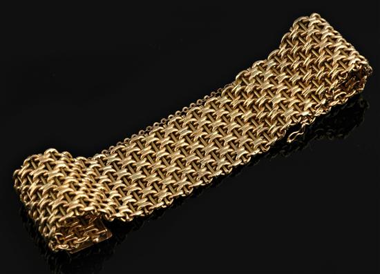 The geometric mesh links interspersed with gold bars to tongue and groove clasp, in 18ct gold, total weight 57.0gms, total length 200mm.