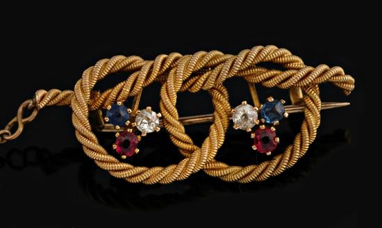 Each loop of the double knot design centrally set with a trio of sapphires and rubies, all in 15ct gold.