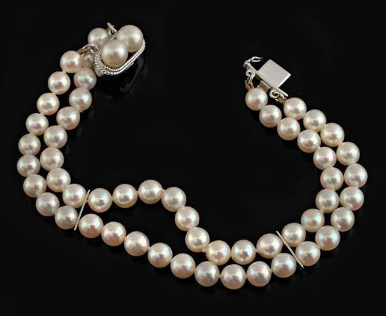 Comprising a double row of pearls measuring 5.5mm to 5.9mm to a silver pearl set clasp, total length 180mm.