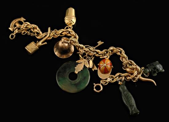 The 18ct gold rope twist bracelet set with ten charms in varying carat weights of gold including jade charm, enamel jockey cap, nephrite penguin and turtle, total weight 23.3gms, total length 190mm.