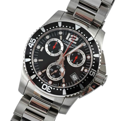 Quartz chronograph, circular black dial with baton numerals, subsidiary dials, signed case, dial and movement, stainless steel case with rotating bezel, stainless steel bracelet bands, model reference 36434566, case reference 34254176, 40mm diameter, with box and papers. See illustration.