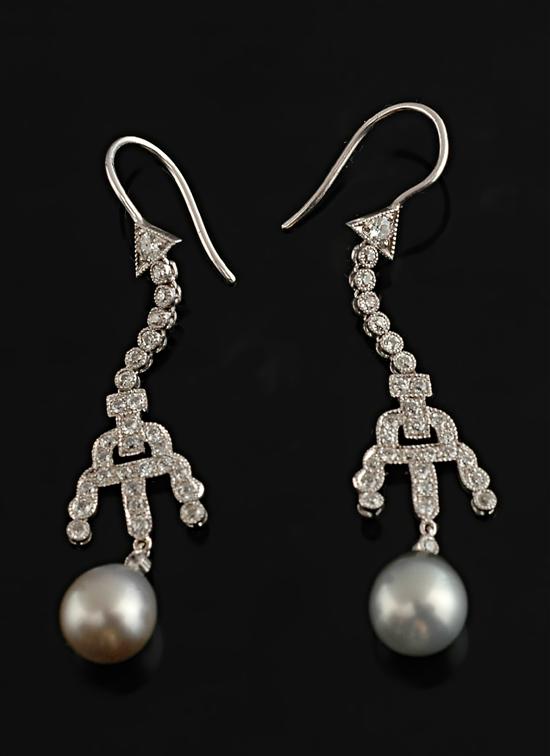 The pearls of silver white hues surmounted by fancy articulated diamond settings totalling 1.00cts, all in 14ct white gold to shepherd hook fittings.