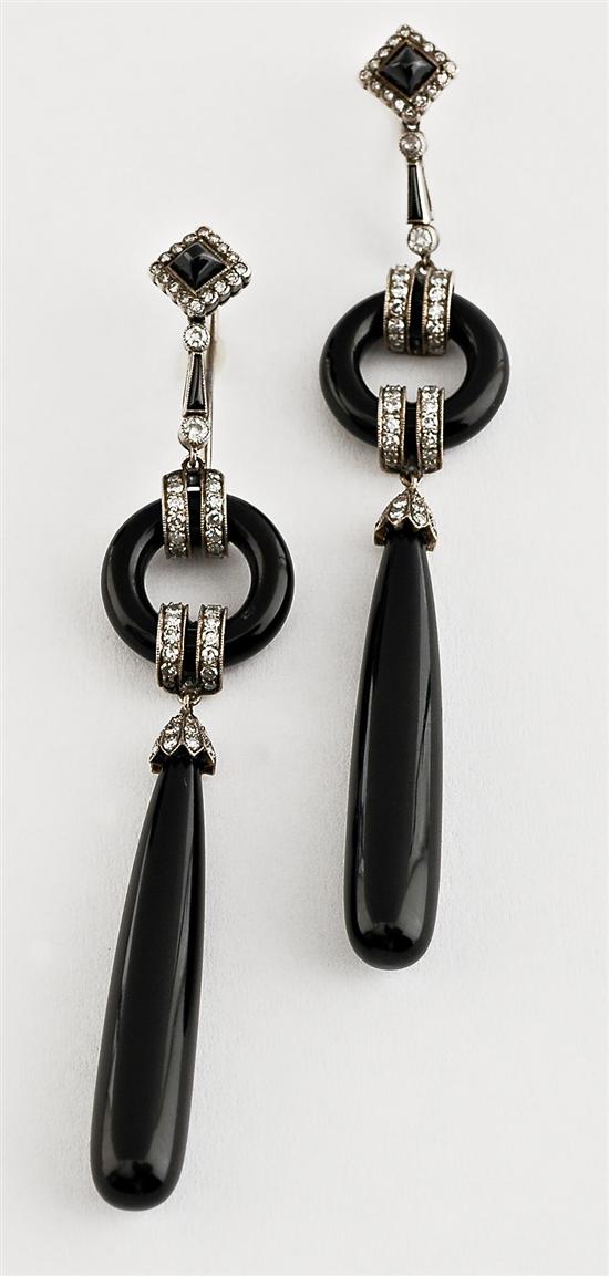 The geometric design of circular and elongated onyx drops with diamond detail, all in 18ct oxidised white gold. See illustration.