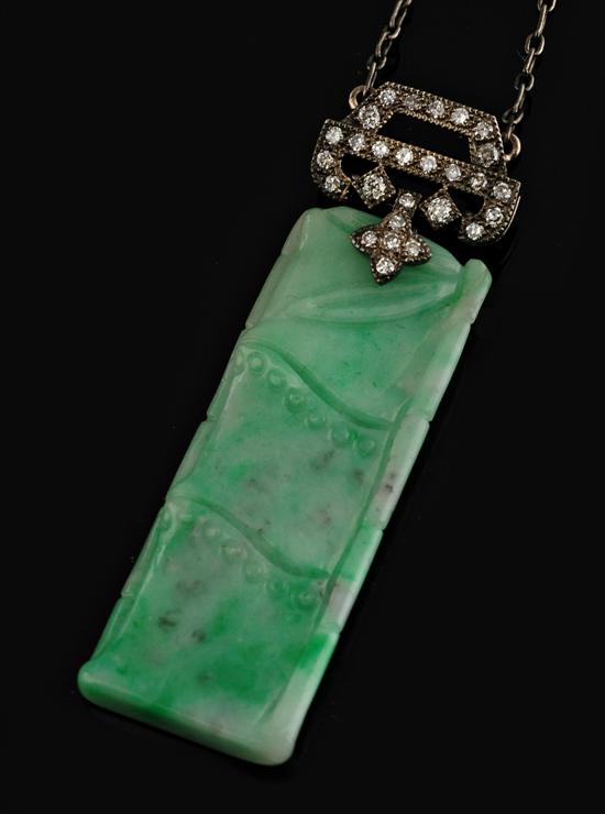 The carved jadeite drop suspended from an Art Deco style diamond fitting, all in 14ct white gold to fine trace chain.