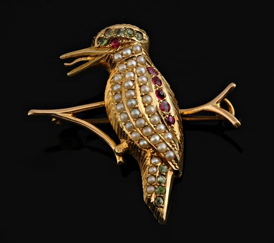 Set with seed pearls and coloured paste, all in 15ct gold.