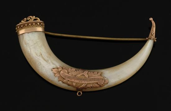 Designed as a tusk, centered with a floral and foliate engraved 9ct gold plaque with "Best Wishes" motif , with further applied decoration.