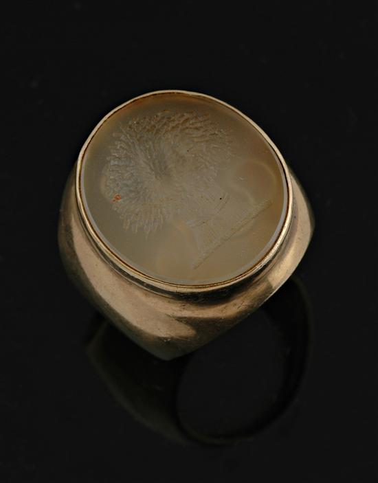 The carved agate with sheaf design and initials "I A" to reverse, all in 9ct gold. See illustration.
