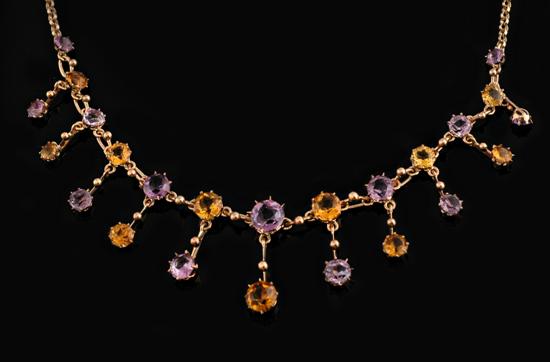 Of fringed design having thirteen graduated knife edge drops each set with an amethyst and citrine suspended on a fine belcher link chain, all in 9ct gold. See illustration.