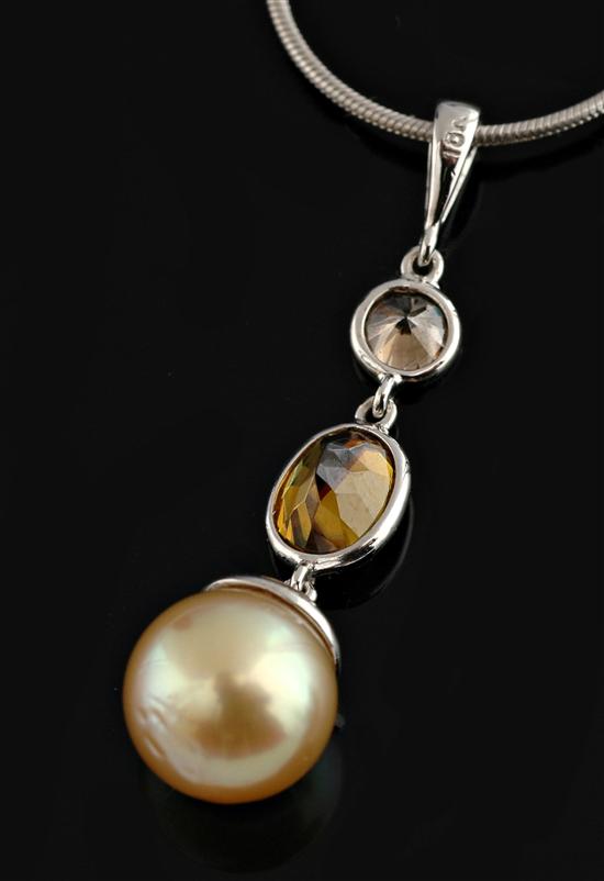 Comprising a round pearl of golden hues measuring 9.28mm suspended below a collet set oval sphene weighing 1.00ct and a round brilliant cut cognac diamond weighing 0.28cts, suspended on snake chain, all in 18ct white gold.