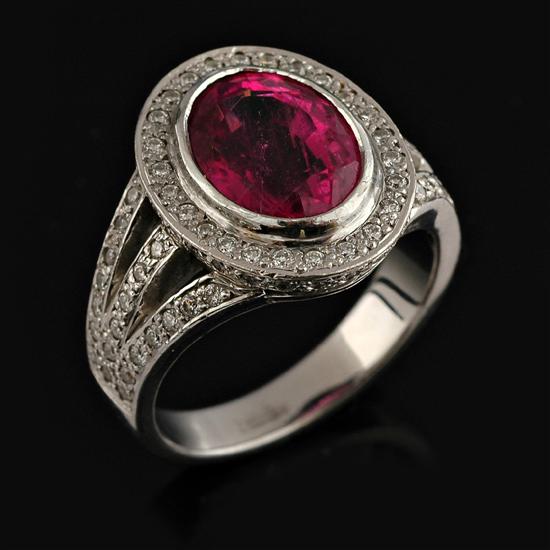 Centrally set with an oval pink tourmaline weighing 3.20cts surrounded by a border of grain set diamonds with open diamond set shoulders all in 18ct white gold.