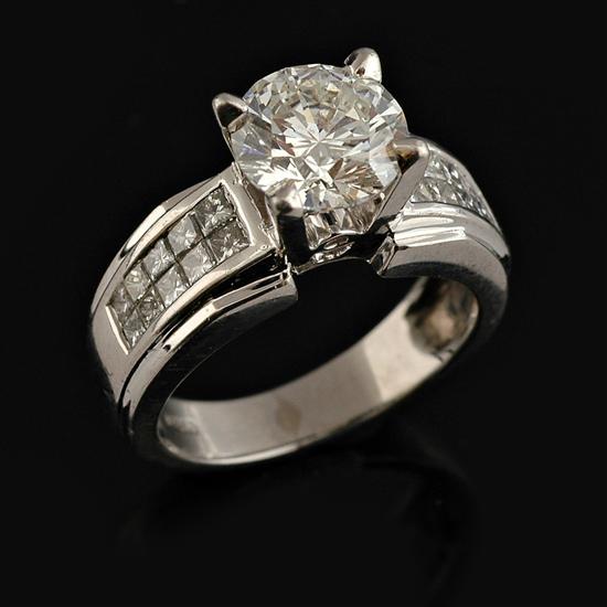 The round brilliant cut diamond weighing 1.73cts in raised claw setting flanked by channel set princess cut diamonds to each shoulder, all in 18ct white gold, EGL Certificate available. See illustration.