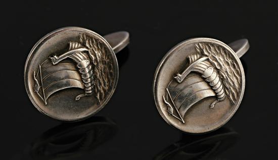 Designed by Harald Nielsen, the circular discs with raised galleon motif in sterling silver to swivel T-bar fittings, style reference 50, boxed.
