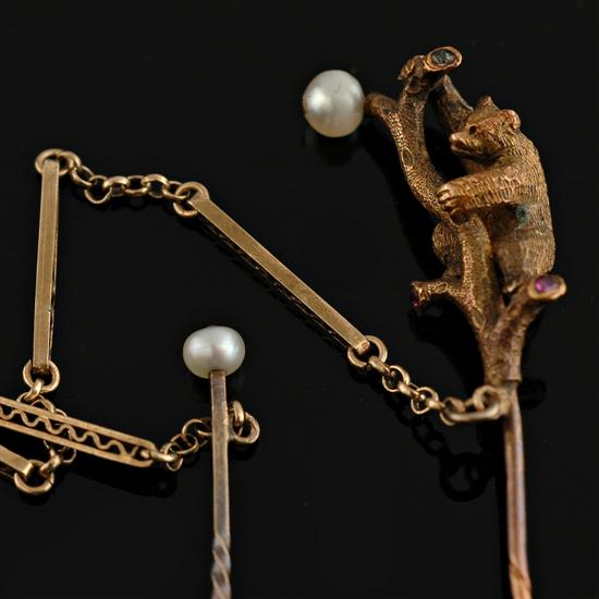 The finely modelled bear on a branch with pearl and gemstone detail with secondary pearl set stick pin and safety chain, all in 15ct gold. See illustration.