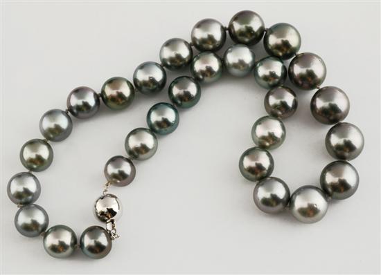 Comprising twenty nine round pearls of silver grey hues measuring 12.0mm to14.7mm to a 14ct white gold clasp, total length 440mm.