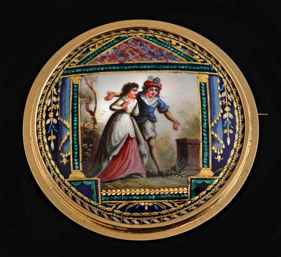 The hand painted scene on ceramic, bordered by intricate gold and enamel detail within an 18ct gold mount. N.B. some damage. See illustration.
